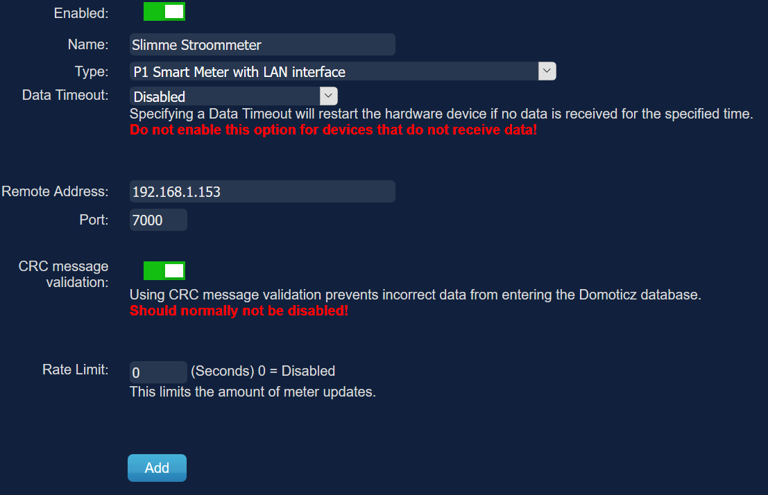 Voeg de slimme meter configuratie toe aan Domoticz -> Setup -> Hardware (gebruik ip-adres van de raspberry pi als Remote Address)