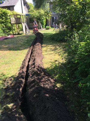 De overkapping staat zo’n 30 meter achter het huis en dat was eigenlijk de grootste uitdaging. Hoe leg je daar een kabel heen die ook volgens de norm op 60 cm diepte ligt.. Gelukkig verhuren ze bij Jansen Verhuur in Bergijk een kettinggraafmachine waarmee je heel gemakkelijk een mantelbuis met meerdere kabels op de vereiste diepte legt.
